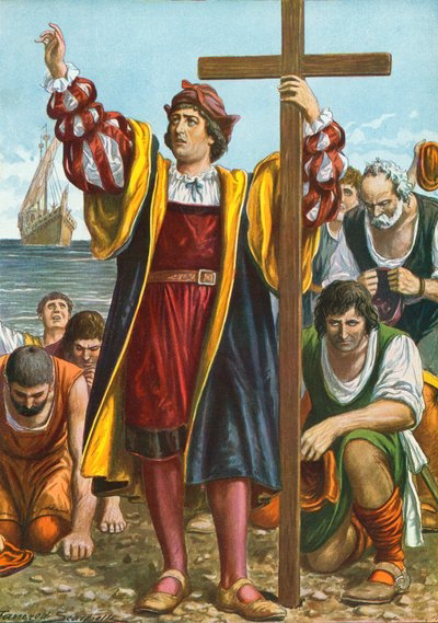 It is in this context that I looked again at Tancredi Scarpelli's painting, Christopher Columbus Arriving in the New World. There is no ambiguity in the scene. Columbus stands with a cross in hand, flanked by men who bow, kneel, or gaze reverently. Behind them, the ship still floats, its sails furled like banners of arrival. This is not exploration; it is declaration. The land is not discovered; it is claimed.